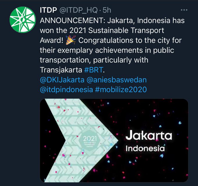 "Alhamdulillah, Jakarta terpilih sebagai kota terbaik dunia dalam Sustainable Transport Award 2021. Saya turut berbangga dengan pencapaian Jakarta dalam peningkatan inovasi transportasi terintegrasi. Ini adalah pengingat bahwa kami harus terus berupaya meningkatkan layanan transportasi yang sudah ada, sehingga kenyamanan warga dalam bertransportasi terjamin," ucap Gubernur Anies dilansir dari PPID Pemprov DKI Jakarta, Sabtu (31/10).