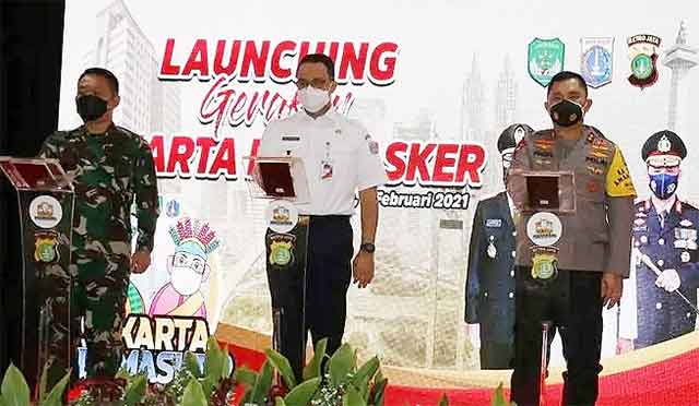 JAKARTA, Berita HUKUM - Gubernur DKI Jakarta Anies Baswedan, Kapolda Metro Jaya Irjen Pol Fadil Imran dan Pangdam Jaya Mayjen TNI Dudung Abdurrachman, bersama-sama meluncurkan logo gerakan program 'Jakarta Bermasker', di Gedung Promoter, Mapolda Metro Jaya, Jakarta, Rabu (3/2).