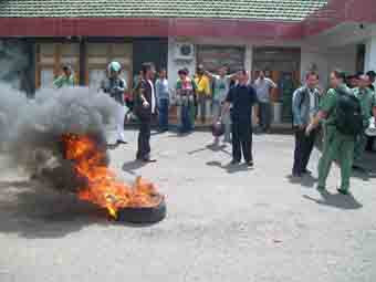 Begitu memasuki sore, massa yang tergabung dalam Forum Komunikasi Kerukunan (FKK) 124 berjalan menuju mimbar orasi. Lalu, mereka membakar spanduk tepat di foto Presiden SBY dan foto para korban. Sebelum spanduk habis terbakar, aparat kepolisian turun memadamkan api. Spanduk yang sudah separuh terbakar selanjutnya diamankan polisi.