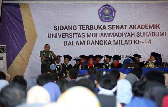 Hal tersebut dikatakan Panglima TNI pada Sidang Senat Terbuka Akademik Universitas Muhamadiyah Sukabumi dalam rangka Milad ke-14, yang dihadiri oleh 1.500 orang, terdiri dari mahasiswa, FKPPI, Pemuda Pancasila, Pemuda Muhamadiyah, GP Ansor, Angkatan Muda Siliwangi, di Gedung Anton Soejarwo Stukpa Polri, Jawa Barat, Selasa (13/6).