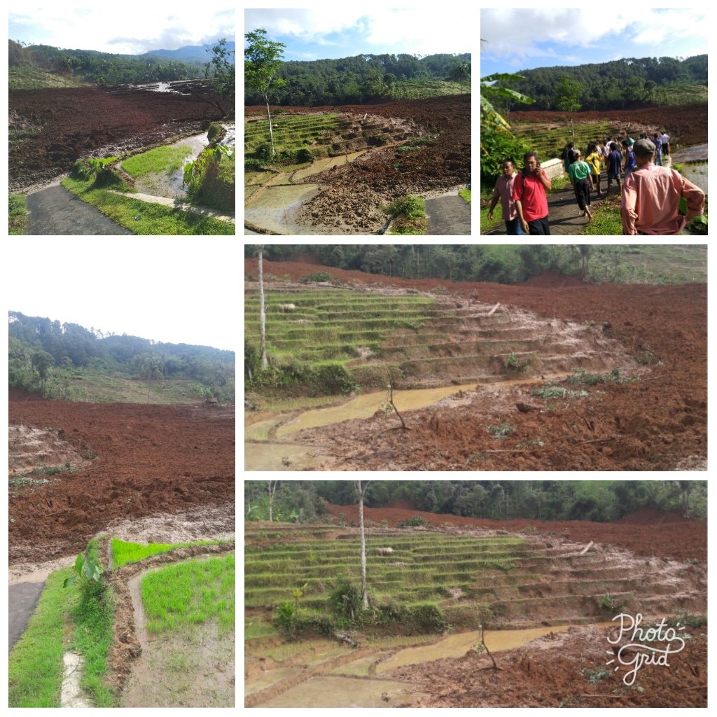 Lokasi longsor di Desa Pasir Panjang Kecamatan Salem merupakan daerah zona rawan sedang hingga tinggi longsor. Mahkota longsor dari perbukitan di hutan produksi Perhutani BKPB Salem Petak 26 PlRPH Babakan longsor kemudian menimbun sawah di bagian bawah. Saat longsor cuaca tidak hujan. Lahan pertanian sawah berada di bagian bawah agak jauh dari perbukitan mahkota longsor.(bnpb/bh/sya) |