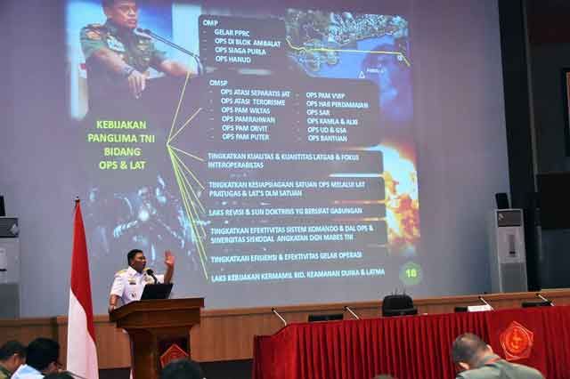 "Mencermati perkembangan lingkungan strategi dan kemungkinan ancaman di atas, maka TNI telah melaksanakan berbagai operasi baik Operasi Militer Perang (OMP) maupun Operasi Militer Selain Perang (OMSP) untuk penegakan kedaulatan wilayah, keamanan dalam negeri dan tugas-tugas perbantuan," ujar Laksdya TNI Dr. Didit Herdiawan.