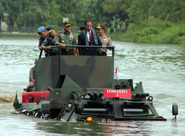 Kedatangan Presiden RI di Mabes TNI di sambut dengan jajar Kehormatan di Pintu Utama (Delta Il). Selanjutnya Presiden RI didampingi Panglima TNI mengendarai panser Anoa Amphibi yang di produksi PT Pindad hasil karya anak bangsa. Panser Anoa Amphibi dikendarai oleh dua Plajurit wanita TNI-AD atas nama Serda (K) Lutfiah (Pussenif Kodildat TNI AD) dan Serda (K) Melysa Situmorang (Pusdikif TNI AD) dengan rute dari gerbang Utama Delta " menuju danau Mabes TNI. Panser Anoa Amphibi selanjutnya melintasi danau.(bh/yun) |