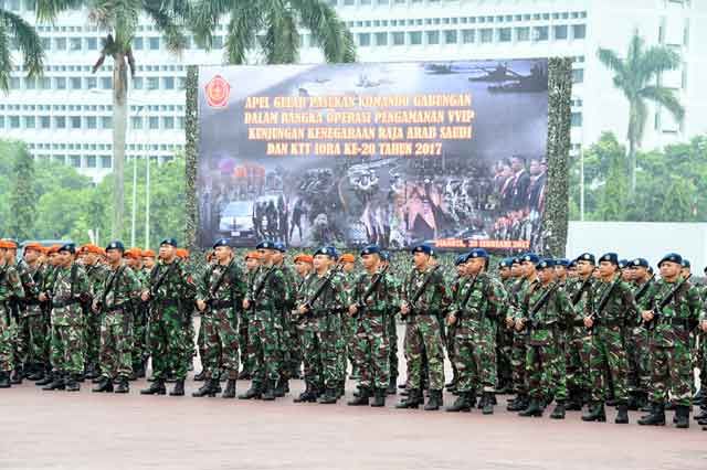 JAKARTA, Berita HUKUM - Tentara Nasional Indonesia (TNI) menggelar Apel Gabungan Pengamanan Very-Very Important Person (VVIP) kunjungan kenegaraan Raja Arab Saudi Salman bin Abdul Aziz Al Saud dan Pengamanan Konfrensi Tingkat Tinggi (KTT)Indian Ocean Rim Association (IORA) ke-20 tahun 2017 di Indonesia.