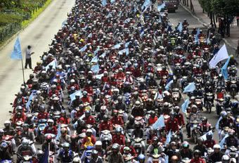 JAKARTA (BeritaHUKUM.com) - Ribuan buruh mengelar aksi longmarch di sejumlah titik di Jakarta. mereka yang terdiri dari berbagai persatuan serikat pekerja, mengelar aksinya dari Bundaran Hotel Indonesia (HI), menuju Istana Kepersidenan dan berakhir di Stadion Gelora Bung Karno Senayan, Jakarta, Selasa (1/4).