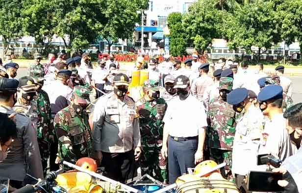 Apel kesiapan tanggap bencana banjir diikuti oleh ratusan peserta apel dari personil TNI-Polri, Pemprov DKI dan unsur Forkopimda DKI Jakarta diantaranya, Kapolda Metro Jaya Irjen Pol Nana Sudjana, Pangdam Jaya/Jayakarta Mayjen TNI Dudung Abdurachman, Pangkoopsau I Marsekal Pertama TNI Tri Bowo Budi Santoso, dan Danlantamal III Brigjen TNI (Mar) Hermanto.(bh/amp) |
